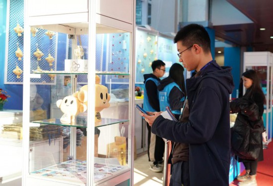 11月29日,一名观展者在自己购买的链博会纪念邮封上加盖了带有“链氪”形象的纪念邮戳。