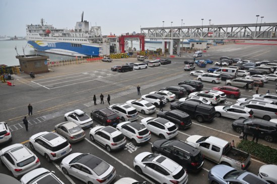 2024年1月26日,车辆在海口新海港等待登船。新华社记者 郭程 摄