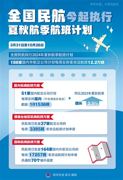 民航局发布的信息显示,2024年夏秋航季批复164家国内外航空公司的每周17257班客货运航班计划申请,共通航70个境外国家,自63个国内城市连接178个国外城市。国际客运航班量继续保持增长,周边国家客运市场显著恢复,至越南、日本、老挝、俄罗斯的客运航班有较大增幅;免签政策利好影响逐步显现,至匈牙利、奥地利、西班牙、马来西亚、泰国、新加坡的航班量明显增长。