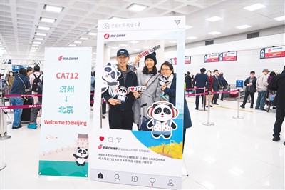中国国际航空北京-济州航线复航仪式3月31日在韩国济州国际机场举行。此次复航的“北京-济州”航线由波音737-800机型执飞,每周三、四、日运营。图为乘坐国航济州至北京航线班机的旅客在值机区拍照留念。