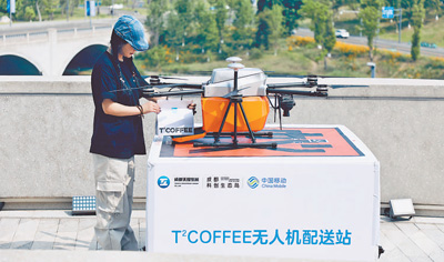 图为在成都科创生态岛,无人机配送咖啡外卖。